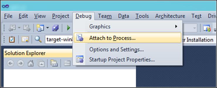Once you’ve launched an elevated instance of VS, instruct it to attach to a process via the Debug->Attach to Process menu item, as seen in Figure 1.