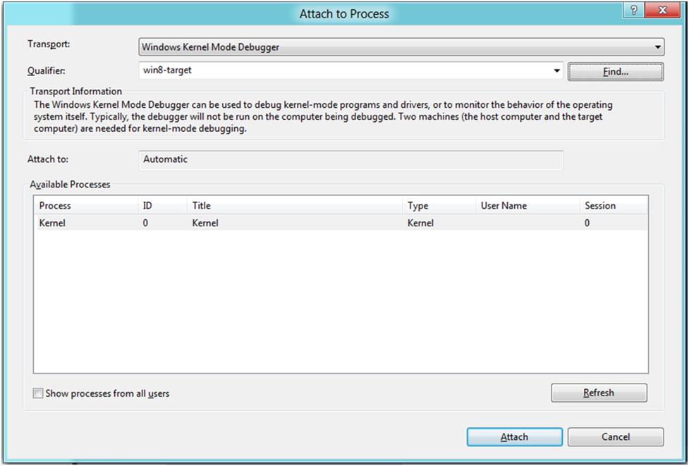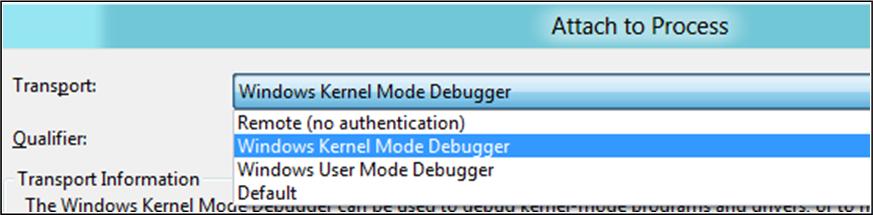 This will bring up the process attachment dialog which, if you’ve done everything correctly up to this point, should have a couple of new debuggers to choose from. We’ll be using the Windows Kernel Mode Debugger, as seen in Figure 2.