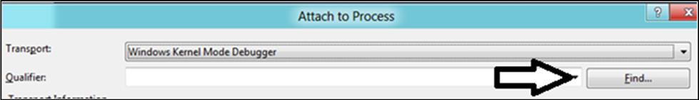 Next, we need to choose which machine we want to kernel debug. This is done via the Qualifier field of the Attach to Process dialog. This should be blank at this point, so we’ll click the Find button to locate a computer to configure (as highlighted in Figure 3).