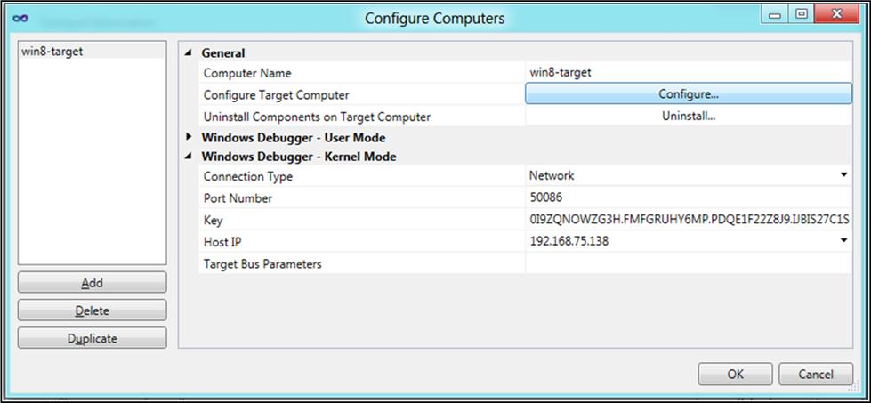 Computers are configured for debugging by their network name, thus you must be able to properly resolve your target computer by name. In our case, we’ve cleverly named the target machine win8-target. Therefore, that’s the name that we will provide for the Computer Name field in the dialog. The result of this can be seen in Figure 5.