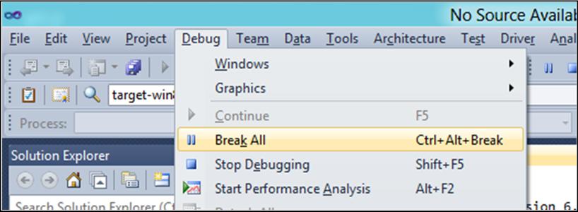 The last thing to do is break into your target machine by clicking the Debug->Break All menu item (Figure 8). Then you’re all set to start enjoying your new development environment (Figure 9)!